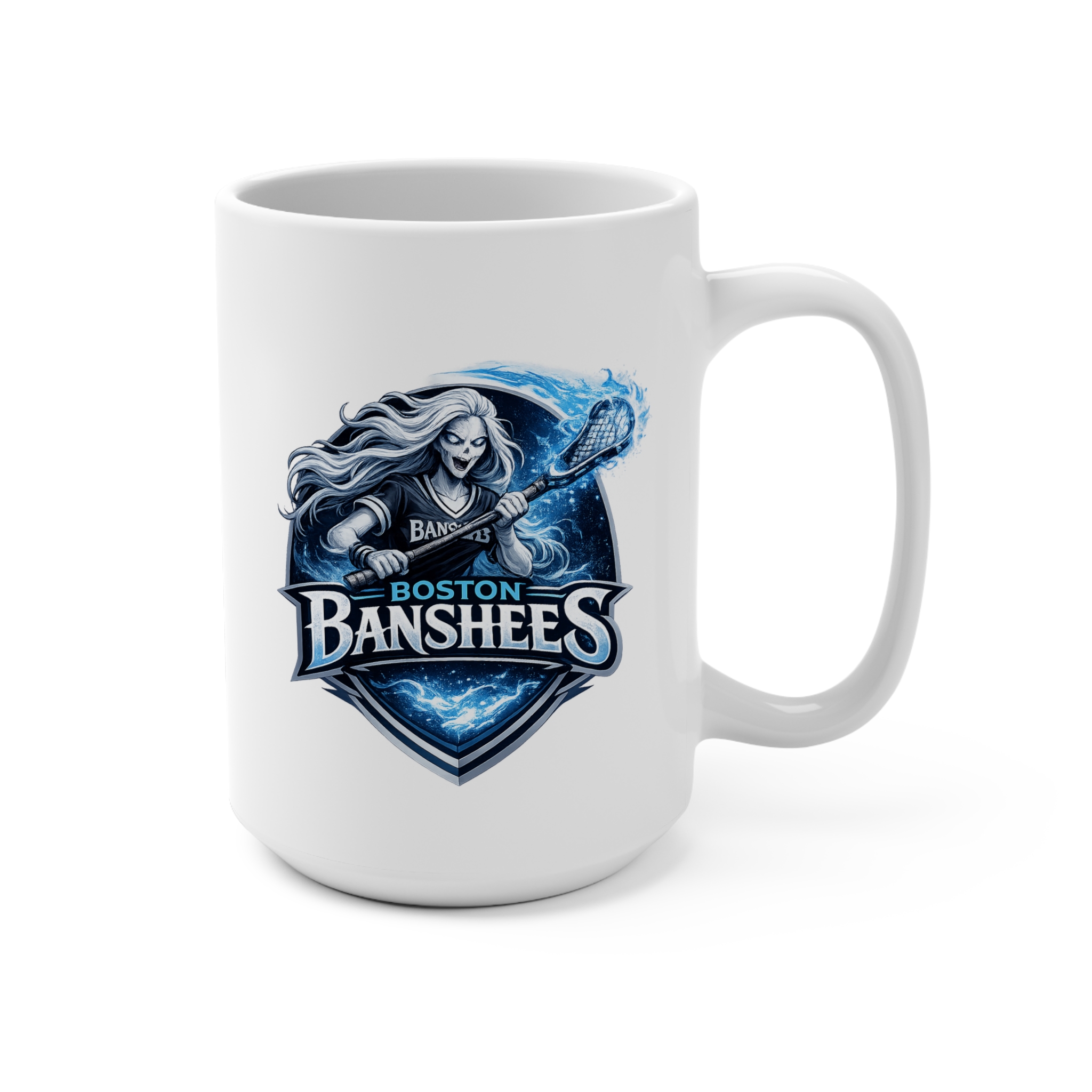 Heat curls up from the rim and the Boston Banshees watch over your morning. This 15 oz ceramic mug carries a bold, icy-blue emblem on a deep black field—an emblem that feels like team spirit and midnight edge at once. It sits substantial in the hand, the C-handle giving a steady grip while the rounded lip guides each sip. Use it between practices, on chilly mornings, or while you sketch plays on a napkin; the graphic keeps its crisp detail through regular dishwasher cycles and quick microwave warm-ups. For fans who like a little grit with their coffee, this mug brings that club-room energy to your kitchen.