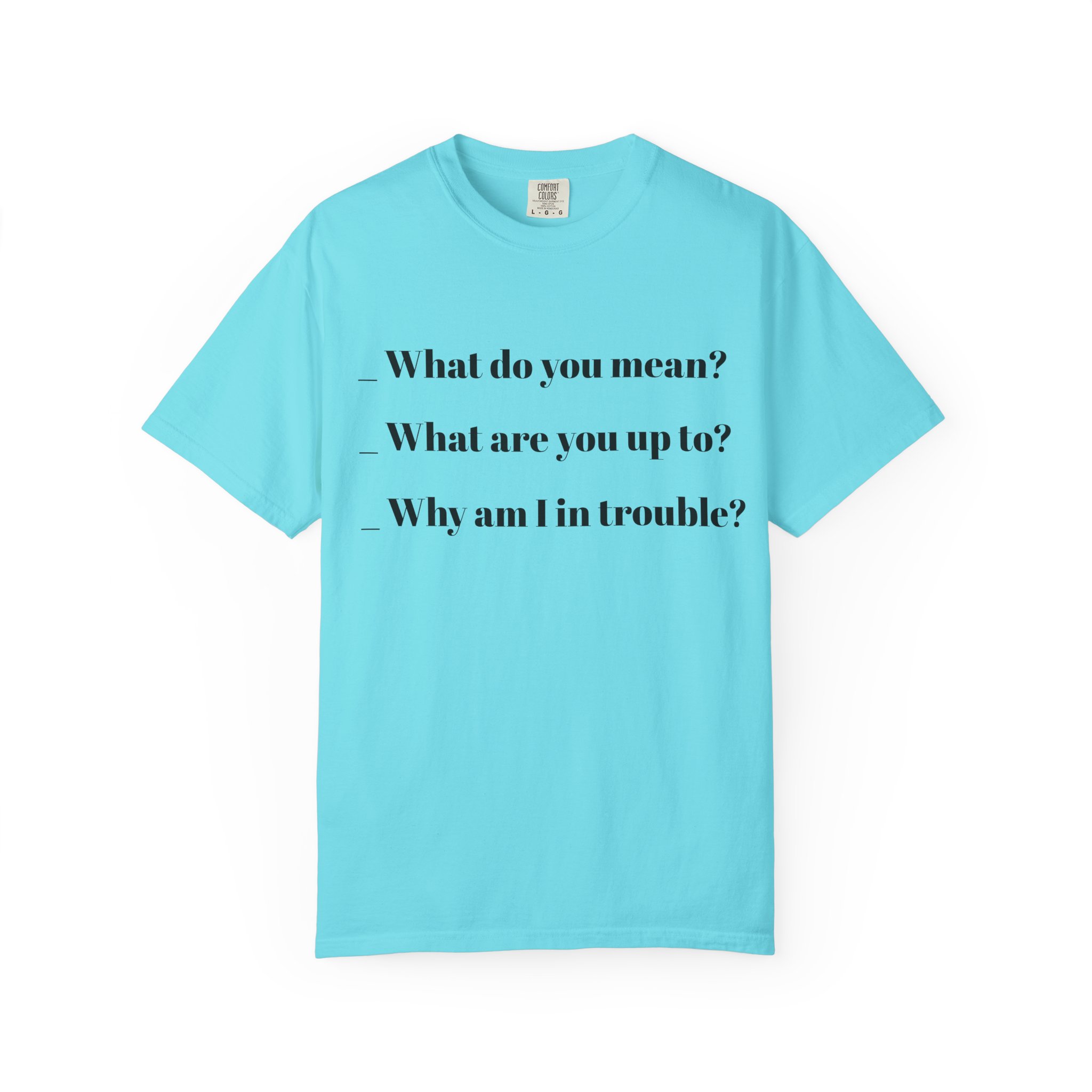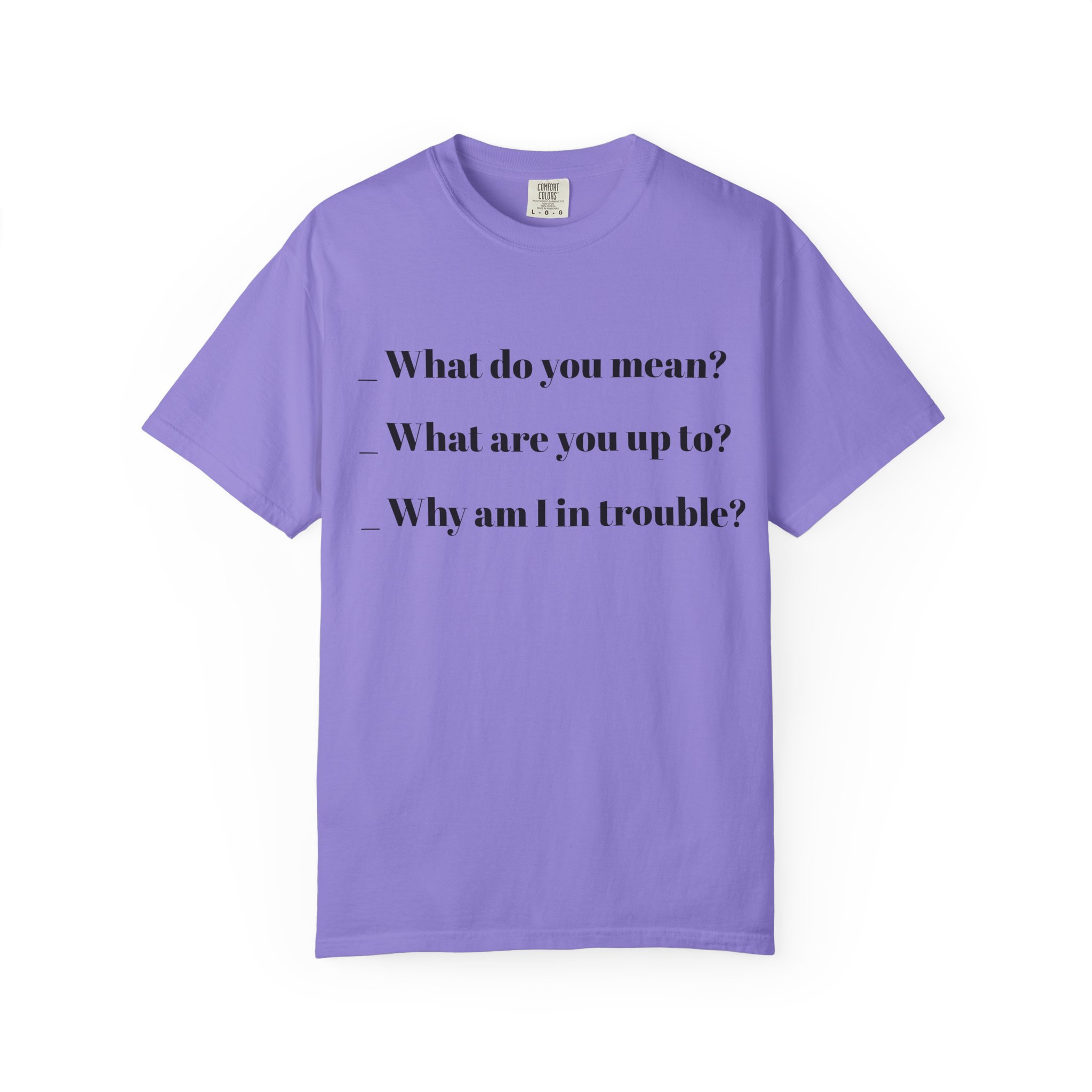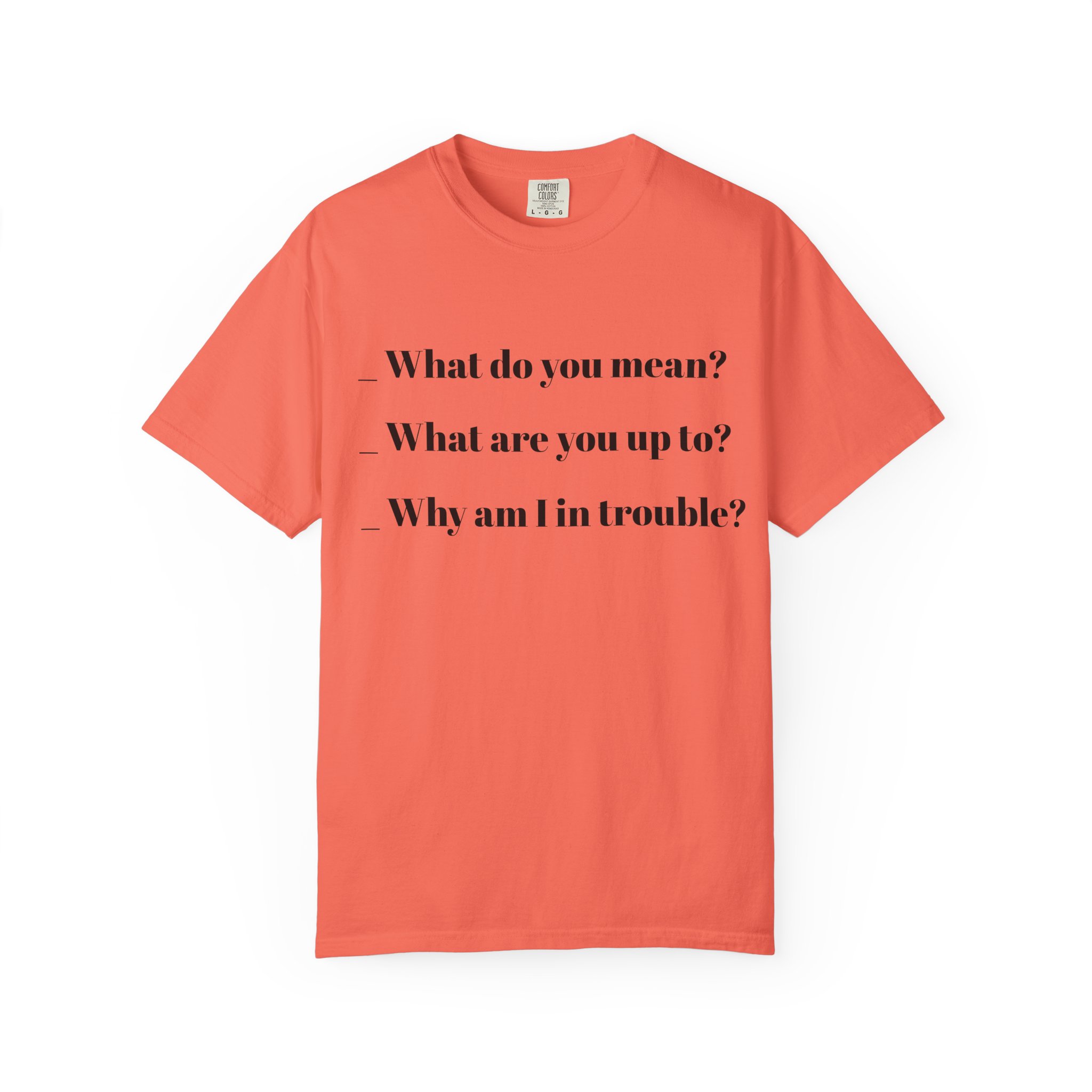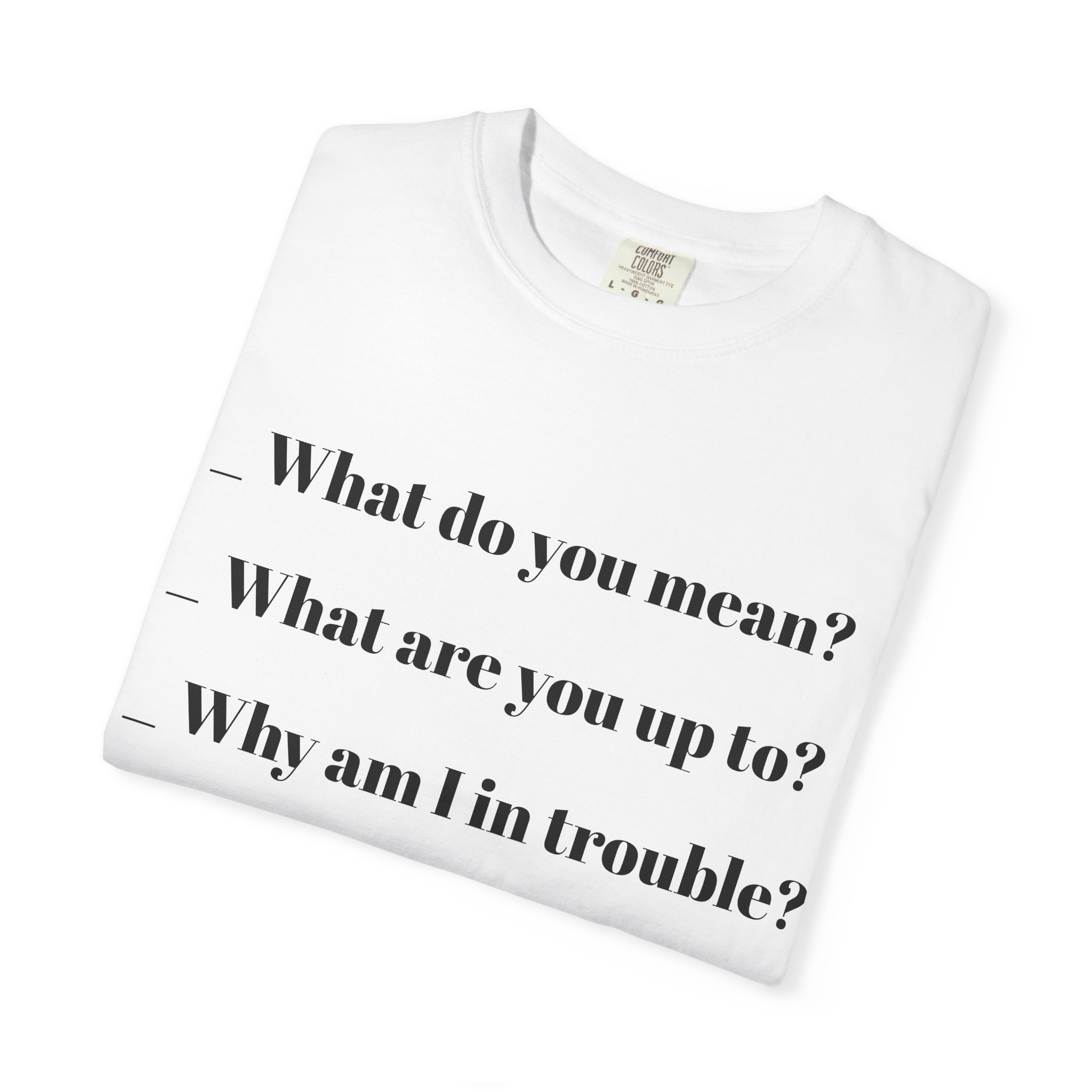 A relaxed, garment-dyed cotton tee that speaks in quiet, witty lines. This heavyweight shirt has a lived-in softness from post-construction dyeing and a clean, minimalist front print that reads like a personal aside — subtle, slightly sardonic, and easy to wear every day. The relaxed fit and tubular knit give a streamlined silhouette without side seams, and the double-needle stitching keeps it durable wash after wash. Wear it layered under a jacket for city walks or alone on slow weekends; it feels familiar from the first wear and holds up like a favorite over time.